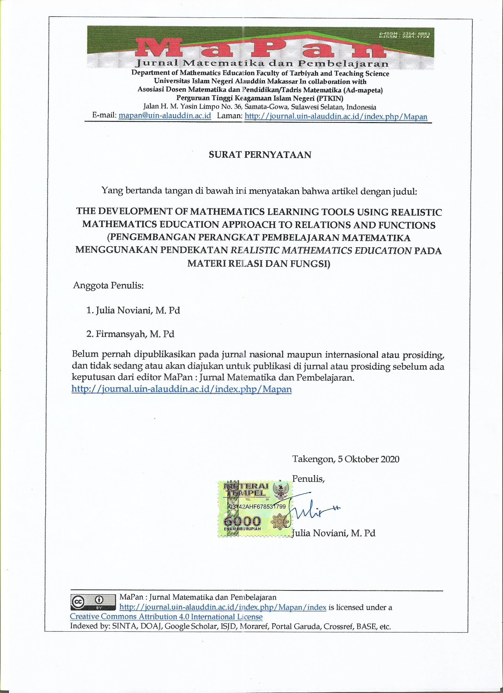 Marlinda, I., & Wijaya, A. (2018). Pengembangan perangkat pembelajaran dengan pendekatan pendidikan matematika realistik berorientasi pada minat dan prestasi developing a learning set with realistic mathematics education approach oriented to the interest and achievement. PHYTAGORAS: Jurnal Pendidikan Matematika, 13(1), 76–87. https://dx. doi.org/10.21831/pg.v13i1.21171.