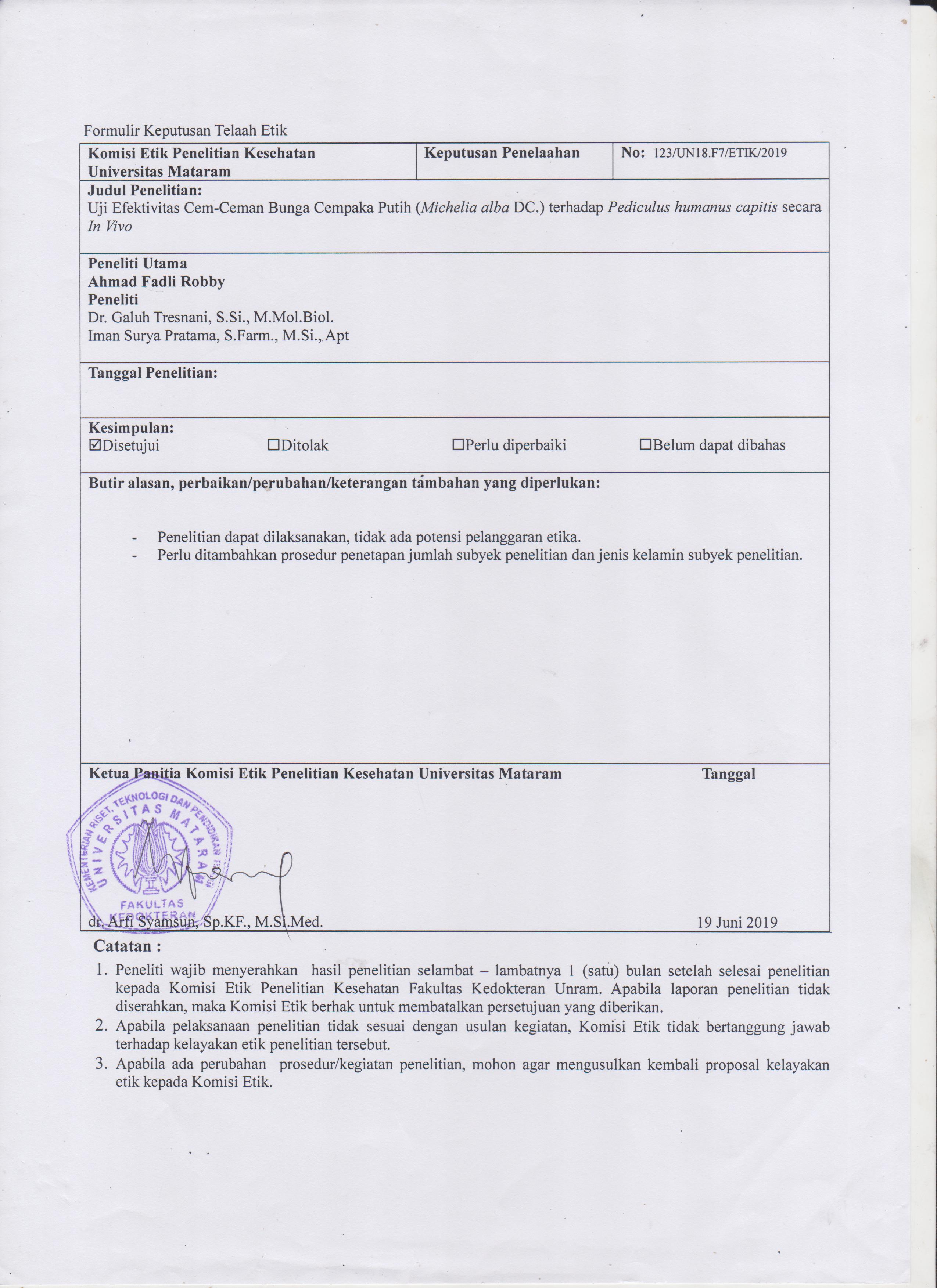 Pediculicidal Activity of Cem-ceman White Cempaka Flower (Michelia alba DC.) against Pediculus humanus capitis