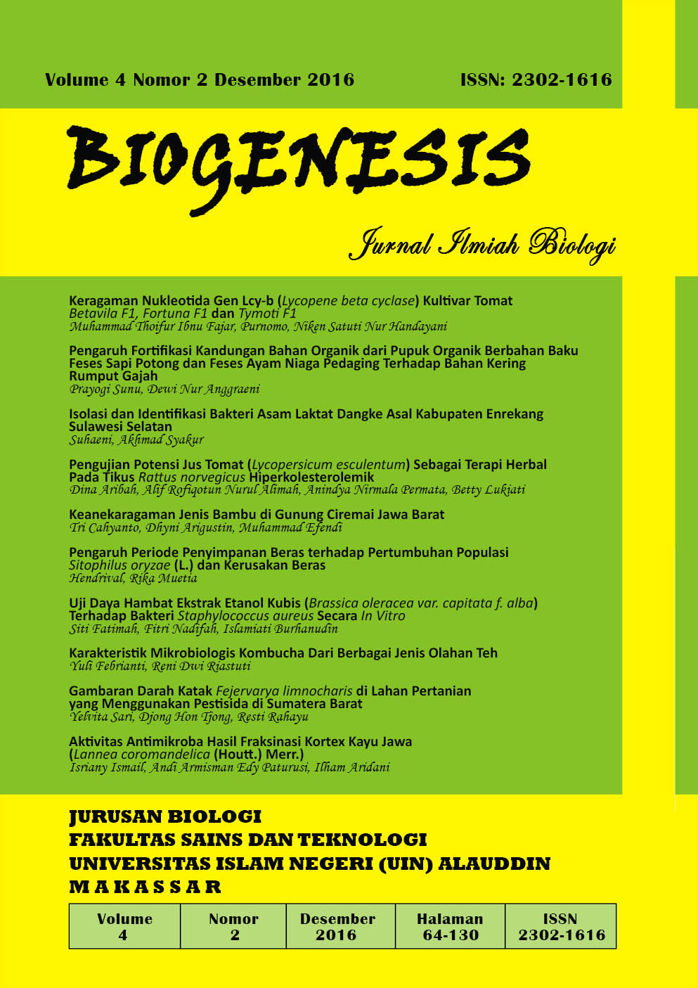 Biogenesis: Jurnal Ilmiah Biologi is published under the terms of the Creative Commons Attribution license. Authors hold the copyright and retain publishing rights without restriction to their work. Users may read, download, copy, distribute, and print the work in any medium, provided the original work is properly cited.