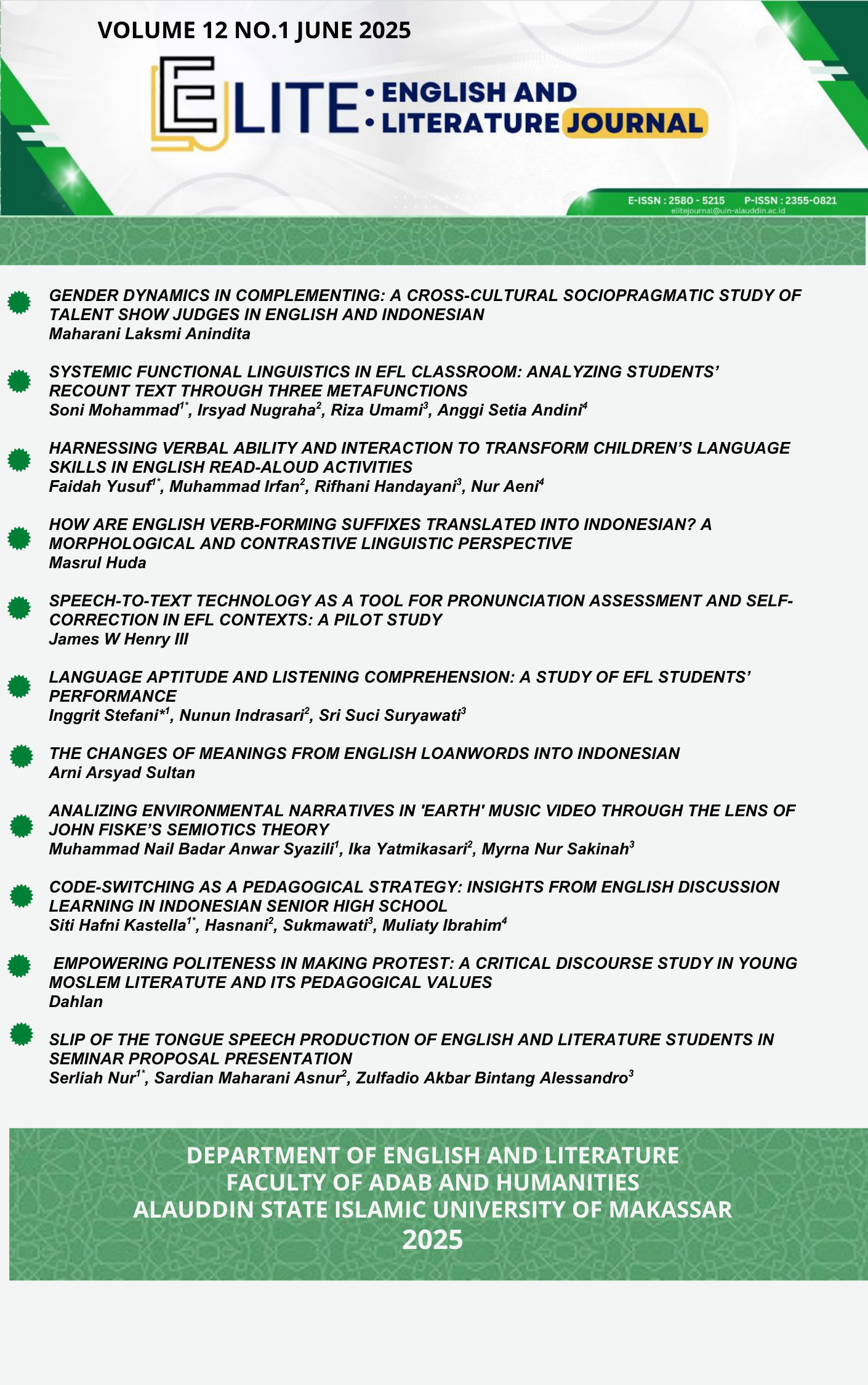 Soedjarwo, G. N. (2021). The power of song in promoting environmental issue. English Language Studies and Applied Linguistics Journal (ELSA).