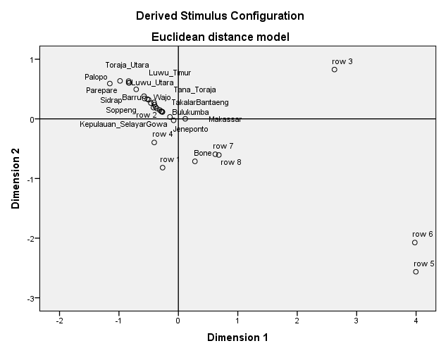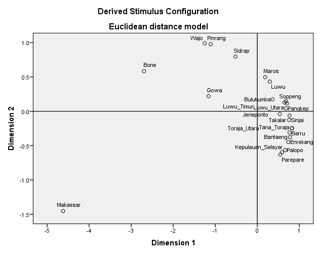 Penelitian ini membahas tentang produktivitas padi berdasarkan pengelompokan kabupaten/kota yang ada di Provinsi Sulawesi Selatan. Variabel produktivitas padi yang telah dikumpulkan akan memberikan informasi menggunakan metode Multidi mensional Scaling (MDS) dalam bentuk peta spasial. Analisis MDS adalah suatu teknik variabel ganda yang dapat digunakan untuk menentukan posisi suatu objek relatif terhadap objek lain berdasarkan penilaian kemi ripannya. Kedekatan objek ditentukan dari nilai stimulus coordinat serta kevalidan hasil dilihat dari nilai stress. Berdasarkan hasil analisis diperoleh 6 kelompok Kabupaten/Kota tersebut memiliki kemiripan produk tivitas padi berdasarkan variabel yang digunakan. Kelom pok I adalah Kepulauan Selayar, Kabupaten Bantaeng, Kabupaten Jeneponto, Kabupaten Takalar, Kabupaten Sinjai, Kabupaten Pangkep, Kabupaten Soppeng, Kabupaten Barru, Kabupaten Enrekang, Kabupaten Tana Toraja, Kabupaten Luwu Utara, Kabupaten Luwu Timur, Kabupaten Toraja Utara, Kota Parepare, dan Kota Palopo. Kelompok ini memiliki tingkat produktivitas padi yang sedang. Kelompok II adalah Kabupaten Bulukumba, Kabupaten Maros, dan Kabupaten Luwu. Kelompok ini memiliki tingkat produktivitas padi yang sedang. Kelompok III adalah Kabupaten Wajo, Kabupaten Sidrap, dan Kabupaten Pinrang. Kelompok ini memiliki tingkat produktivitas padi yang sedang. Kelompok IV adalah Kabupaten Gowa dengan tingkat produktivitas padi sedang. Kelompok V adalah Kabupaten Bone dengan tingkat produktivitas padi sedang. Kelompok VI adalah Kota Makassar dengan tingkat produktivitas padi rendah. Nilai stress yang dihasilkan adalah sebesar 0,01172. Variabel yang mendukung produktivitas padi di provinsi Sulawesi Selatan adalah luas panen (X1), puso padi (X2), produksi padi (X4), Jumlah penduduk (X7) dan jumlah rumah tangga (X8).